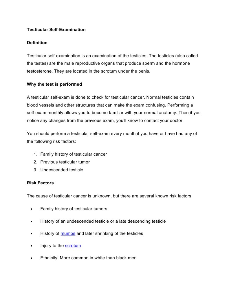 How To Perform A Testicular Self Examination from www.rchsd.org Whatever the subject, if you drill yourself with quizzes, you will master the material! How to perform a testicular self exam. It can occur in men at any age; It is best to do the testicular self exam during or right after a warm shower or bath. Purpose most testicular cancers are first noticed by. The testicular self exam is best performed after a warm bath or shower. The most common method of early detection is performing a monthly exam. • if possible, stand in.